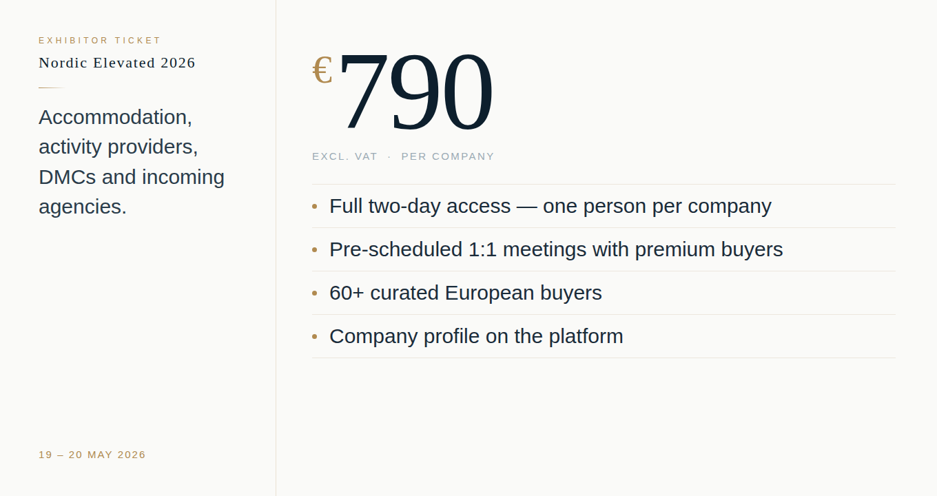 Nordic Elevated takes place on 19–20 May 2026. This is the inaugural edition, a chance to be part of something from the beginning, to help define what premium Nordic B2B looks like online, and to build the buyer relationships that will serve you for years.